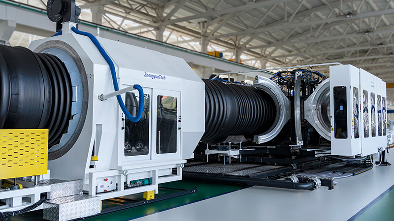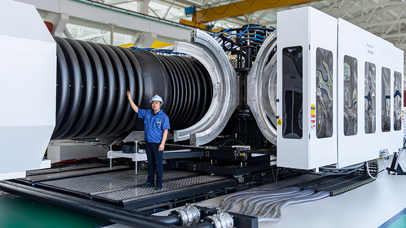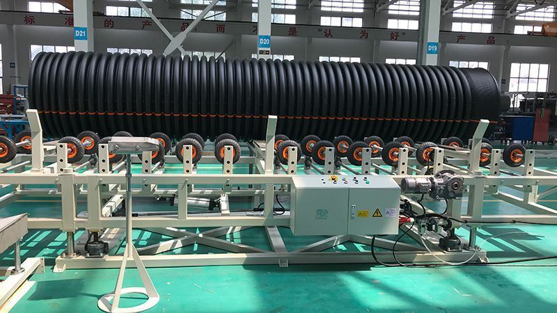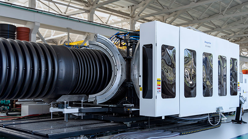 La línea de extrusión ZC-2000H puede ser utilizada para fabricar tubos corrugados de doble pared de HDPE y PP de alta calidad para aplicaciones tales como aguas pluviales, drenaje, infraestructuras e ingeniería civil. Los tubos corrugados pueden fabricarse hasta un diámetro exterior máximo de 2000 mm. Esta línea de extrusión permite una producción de tubos totalmente automática con una velocidad máxima de 0,998 m/min.
