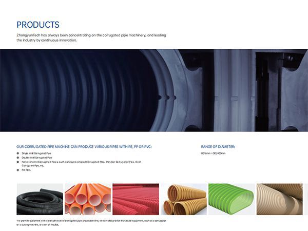 ZhongyunTech es un fabricante mundial de maquinaria para tubos corrugados. Ofrecemos una alta gama de productos tales como máquinas para fabricar tubos corrugados, moldes, equipos posteriores y líneas completas de extrusión, lo que nos permite atender a clientes en diversas industrias, la de tuberías de drenaje, ventilación, construcción, electricidad y electrónica. Contamos con una larga trayectoria en el sector de los tubos corrugados; enfocándonos principalmente en el desarrollo de la tecnología dentro de la industria. ZhongyunTech se beneficia de esta gran experiencia, un profundo conocimiento de las características técnicas de la fabricación de tubos corrugados y tecnología avanzada. El éxito que hemos logrado a lo largo de los años se basa en nuestro firme compromiso con fabricar y suministrar las mejores máquinas para fabricar tubos corrugados de la más alta calidad. Para ZhongyunTech sería un honor tener la oportunidad de ganarnos su confianza y ofrecerle equipos y servicios profesionales.