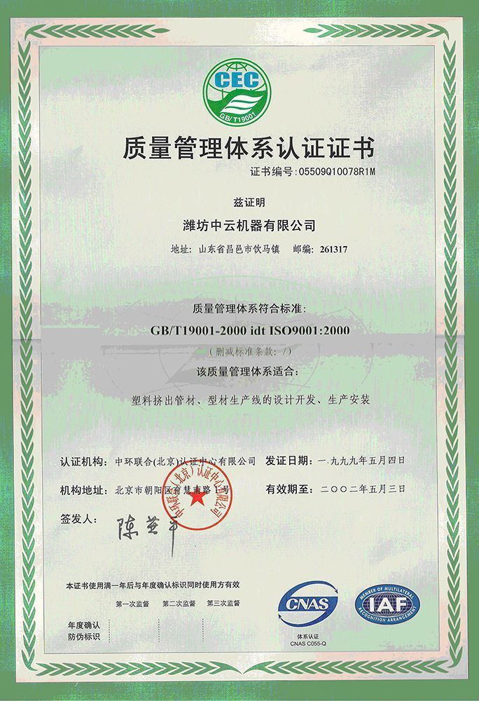 1999, ZhongyunTech obtuvo la certificación del Sistema de Gestión de Calidad ISO9001;