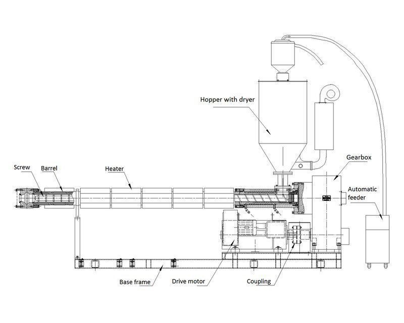 Las resinas plásticas se transfieren a la tolva de secado ubicada en la parte superior de la extrusora a través del sistema de alimentación. Después de que la resina plástica seca ingresa al cilindro del extrusor, se calienta y enfría mediante calentadores y ventiladores industriales instalados en el cilindro del extrusor para controlar la temperatura de la zona de extrusión. Cuando el tornillo gira en el cilindro, la resina plástica en el canal del tornillo se calienta y se funde gradualmente, y luego la resina fundida se ve obligada a moverse hacia la matriz de extrusión mediante las espiras del tornillo.