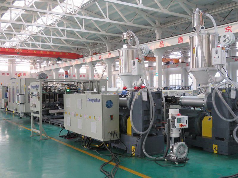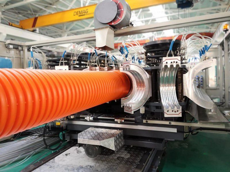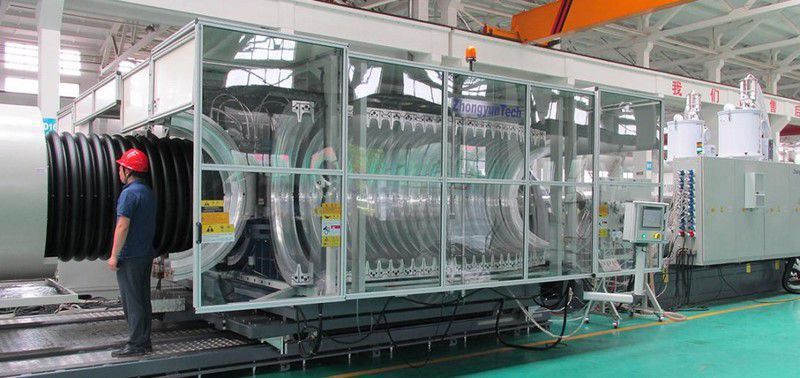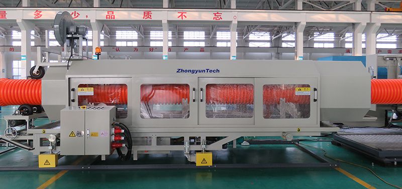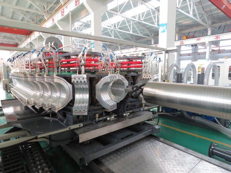 Después de la extrusión, la resina plástica toma la forma de tubo en la salida de la matriz y entra en la corrugadora. Bajo la presión común de aire comprimido y vacío, la capa exterior del tubo de doble pared se adhiere estrechamente a la superficie interior del bloque de molde. Estos bloques de molde refrigerados por agua permiten la formación rápida de la capa exterior ondulada. Y la capa interior del tubo de doble pared se adhiere firmemente al mandril de calibración. El mandril de calibración refrigerado por agua también puede formar rápidamente una capa interior lisa.