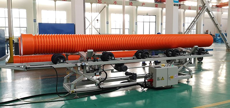 Después de que el tubo ha sido moldeado por la máquina de corrugado, el tubo se enfría con un baño de refrigeración por aspersión, que hace que la temperatura del tubo corrugado descienda rápidamente a la temperatura ambiente. Luego, el dispositivo de tracción lo transporta suavemente hacia la máquina de corte.